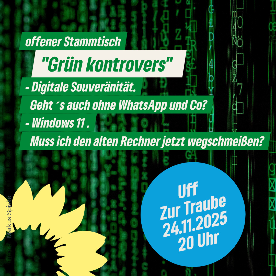 Bei unserem letzten Treffen von der Veranstaltungsreihe "Grün kontrovers" referierte Tim Huprich (arbeitet als Programmierer, Masterstudent Informatik) über das Thema digitale Souveränität und brachte viele Aspekte und Fragen auf den Tisch, die sich jeder in einer zunehmend digitalen Welt stellen sollte. Auch bei den europäischen Regierungen ist dieses Thema sehr präsent. So gab es am 18.11.2025 einen europäischen Gipfel für digitale Souveränität. Leider endete das Treffen, ohne das konkrete Schritte bedacht wurden. Damit wir als Bürger anders mit diesen Fragen umgehen können, wurde dieses Thema ausführlich bei "Grün kontrovers" besprochen und rege diskutiert.