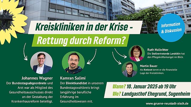 Derzeit gibt es viele offene Fragen zur Zukunft der Gesundheitsversorgung im Landkreis. Deshalb haben wir am 10. Januar 2025 zu einem Infoabend mit dem Bundestagsabgeordneten und Arzt Johannes Wagner und unserem Direktkandidaten und gelerntem Krankenpfleger Kamran Salimi in den Landgasthof Ehegrund nach Sugenheim eingeladen.