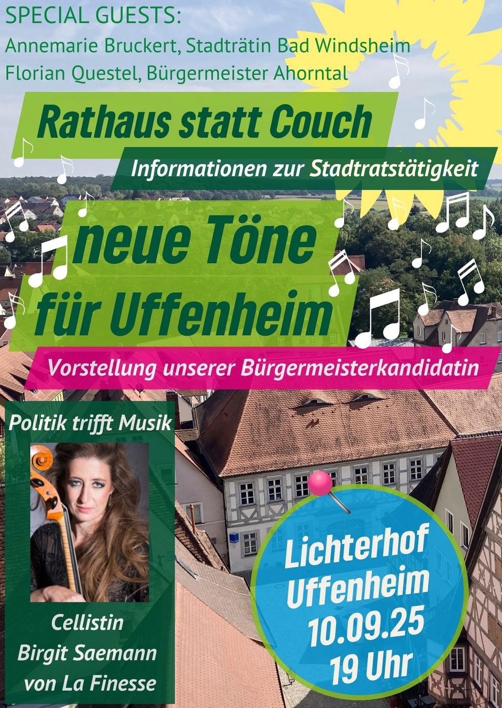 - Besonderer Gast: Florian Questel, amtierender grüner Bürgermeister der Gemeinde Ahorntal, ehemaliger Uffenheimer, teilt seine Erfahrungen und Erfolge mit uns